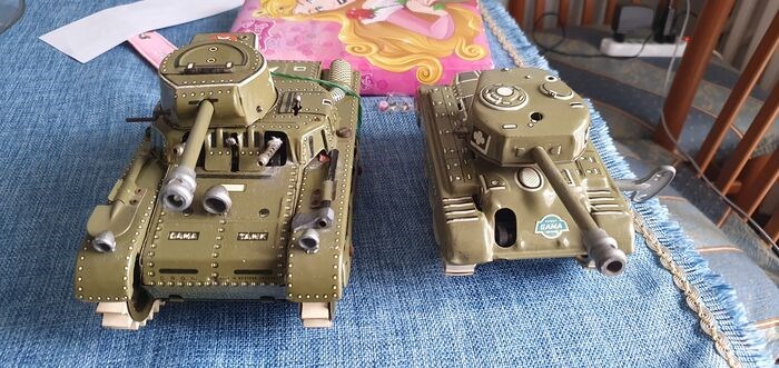 twee gama tanks: een T60 met uitschuifbaar kanon en vonken mitrailleurs (navulbaar met lichtere stenen), draaien aan de pijl op de achterkant bepaalt de richting. De andere is een M98 medium tank. Hij kan kleine loden kogels afschieten (zoals die van jachtpatronen) door ze in het gat boven de koepel te steken en aan de hendel aan de zijkant van de koepel te trekken.In perfect werkende staat,in uitstekende staat.Zonder originele dozen.