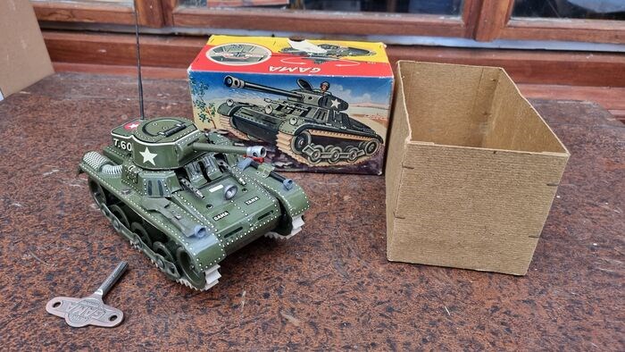 Gama Tank Panzer 60/3/4 T60, gemaakt in West-Duitsland 1959. Werkt perfect met opwindsleutel en alles werkt. Doos in nieuwstaat, tijdschriftbodem nooit gespeeld. Rupsbanden in perfect werkende staat. 19cm lang.