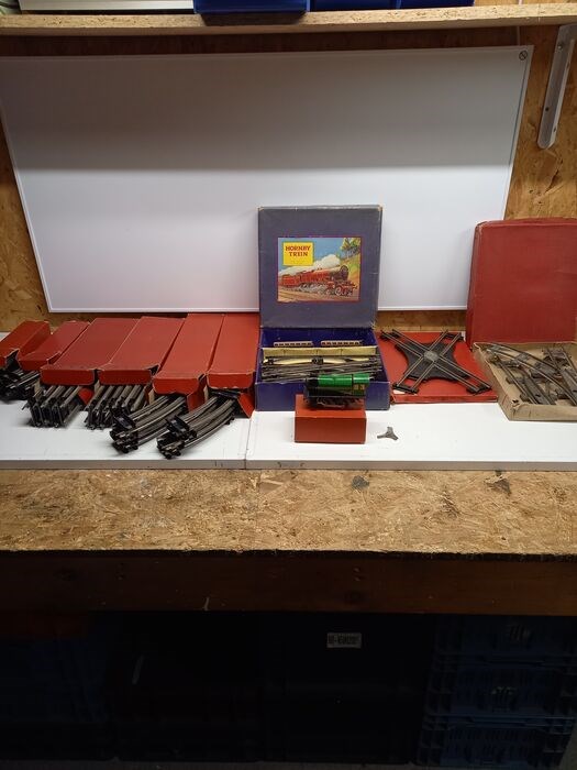Hornby/Meccano Clockwork - Uurwerk uitgebreide trein set in zeer goede staat en in originele verpakking. Zowel de trein als de rails en de dozen zien er zeer goed uit gezien de leeftijd van de spullen. De spullen komen uit de eind jaren 40 begin 50.