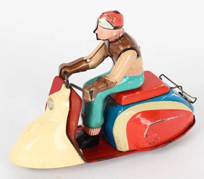 Uitzonderlijk speelgoed dat een man voorstelt die een scooter van het type Lambretta bestuurt.