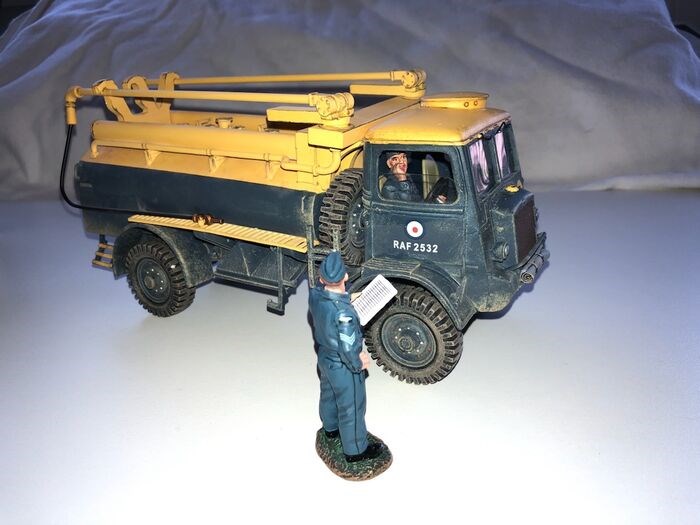 Bedford QL RAF Fuel Bowser plus Sergeant, geeft instructies aan chauffeur.
