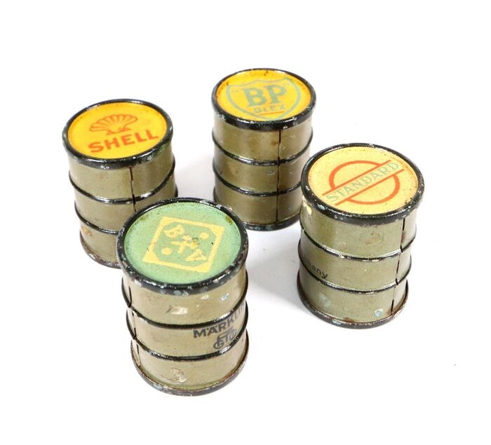 Vier fraaie blikken Märklin tonnetjes/vaten met opschriften. De vaten verkeren in een nette staat, uiteraard, met enkele gebruikssporen.