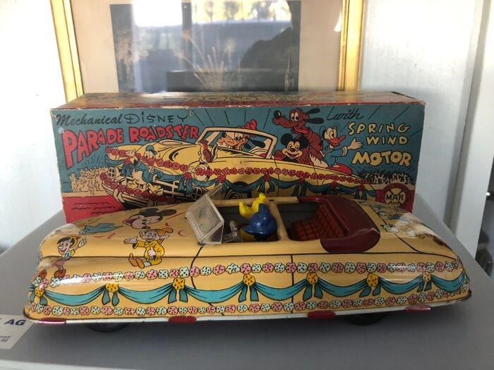 Te koop een zeer zeldzame Marx Walt Disney Parade Car 1950's Mickey en Goofy complete cabrio werkt en is in zeer goede staat, de voorruit is ook zeer goed zie foto. Originele doos is gebruikt, zie foto's.