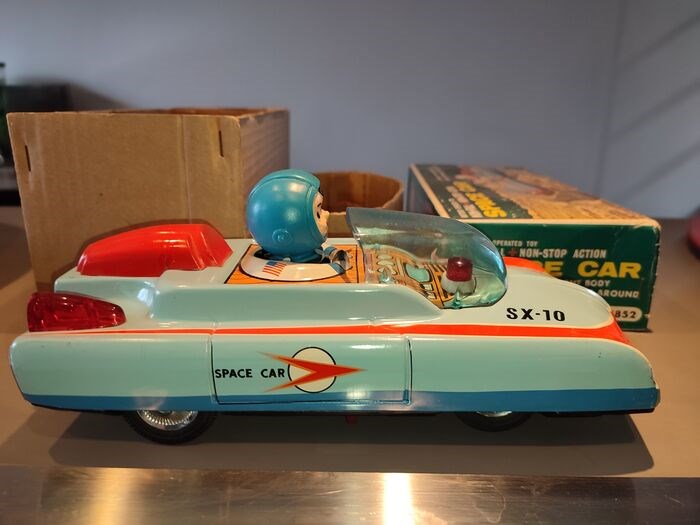 Originele Space Car SX-10 van Masudaya Japan uit de jaren 50/60 Nieuwe uitzonderlijke staat. Op batterijen werkende blauwe en rode ruimteauto van blik en plastic met drop-and-bump-and-go-actie. Vinyl pilotenjongen hoofd achter een open gebogen voorruit met daarin een rood lampje. Achter de piloot zit een rode plastic motorkap en de achtervleugels hebben werkende achterlichten. Gemerkt SX-10. Anti-val actie met knipperlicht.