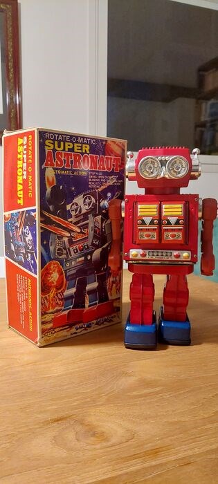 Super Astronaut-robot gemaakt in Taiwan door het bedrijf SJM eind jaren 70. Het is een op batterijen werkende robot, gemaakt van blik en blik, met draaiende actie, openslaande deuren en schietende geweren. Het presenteert een chromen frontplaat met felle kleuren. Deze robot is in uitstekende cosmetische en werkende staat (hoewel hij erg luidruchtig is en langzaam loopt). Originele doos wordt meegeleverd in bijna perfecte staat, geïllustreerd met prachtige kleuren.