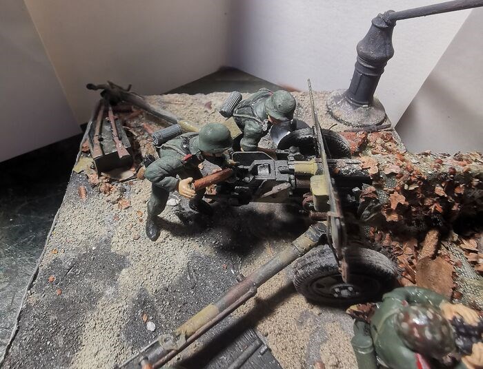 Stalingrad, 4 Duitse artilleristen (tamiya) gebruiken een Russisch antitankkanon. Het stuk is gecamoufleerd met camouflagenetten. Het diorama is zeer gedetailleerd, wapens, granaathulzen, lantaarnpalen etc. Het diorama zal bij eventuele kleine breuken, een beetje lijm lost alles op LEES ZORGVULDIG voor extra-continentale bestemmingen of overzeese eilanden en gebieden kunnen extra verzendkosten worden toegepast