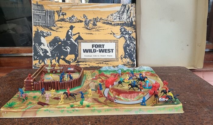 Fort Wild West 1960 (eerste westerse tv-serie) van Heinrich Wimmer gemaakt in Duitsland. Werkt geweldig met Winder, Cowboy, Indians, Originals en Complete Diligence-personages. Bord in perfecte staat (lichte opening van 0,5 cm aan een rand), vervaagde maar complete doos.