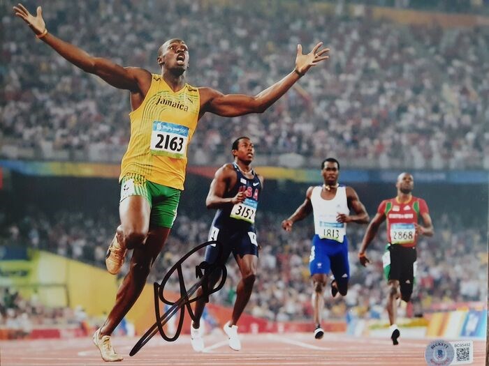 Prachtige gesigneerde foto van Usain Bolt nadat hij weer heeft gewonnen.