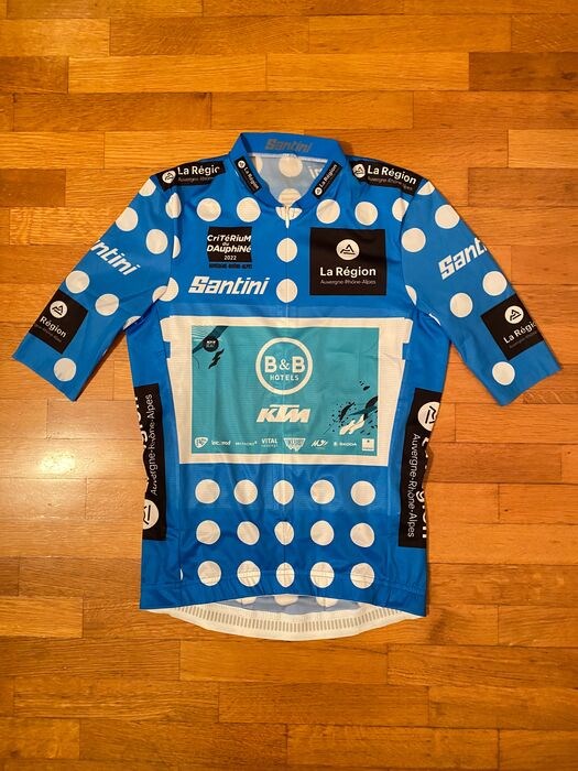 Het blauwe stippenshirt van Pierre Rolland tijdens het Critérium du Dauphiné 2022