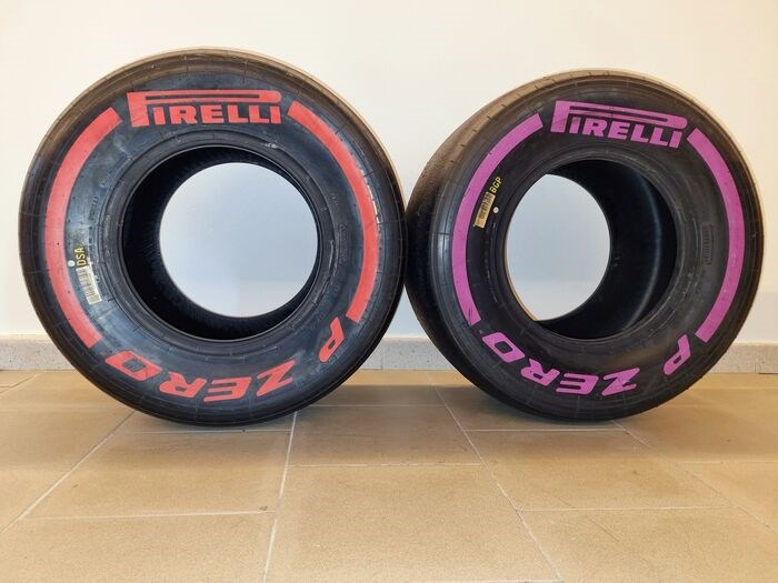 De set bevat een paarse Ultrasoft-achterband en een rode Supersoft-achterband.