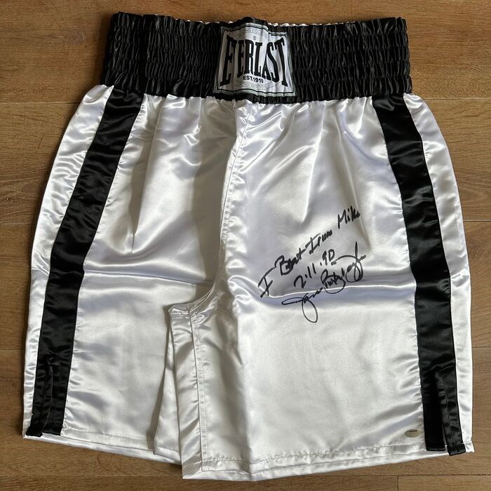 Door James "Buster" Douglas, handgesigneerd, zwart, Everlast bokskoffer, gesigneerd met zwarte viltstift. De stam is gegraveerd "I Beat Iron Mike, 2-11-90"