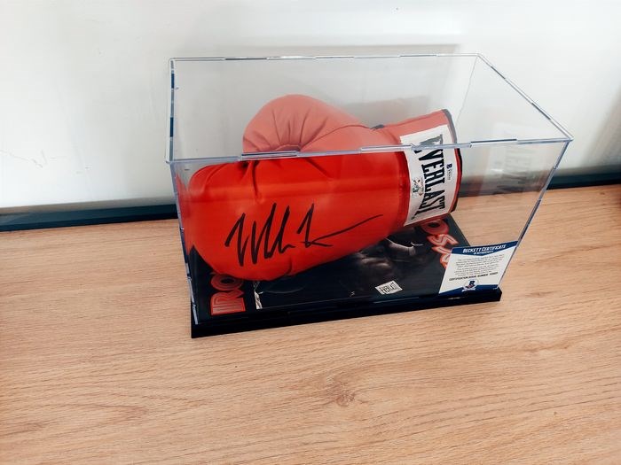 Everlast-handschoen met originele Mike Tyson-handtekening, met de hand ondertekend in een sessie die persoonlijk is geverifieerd door leden van Beckett Authentication Services, een van de leiders op het gebied van echtheidscertificaten, en het Fiterman Sport-hologram, dubbele authenticiteitscertificering. Authenticiteit gegarandeerd. Dit is een nieuwe rode handschoen met een zwarte handtekening. Het is voor de linkerhand, degene die Mike Tyson gebruikte om zoveel knock-outoverwinningen te behalen met zijn rechte stoot. De handtekening is in perfecte, onberispelijke staat. Het authenticiteitsnummer staat in de handschoen en het COA. Het bevat ook een mooie en speciale displaydoos van hoge kwaliteit, gepersonaliseerd met de artistieke afbeelding van Mike Tyson en het opschrift 'Iron Mike Tyson', met een perfect beschermend glas. Klaar om geplaatst te worden en je te laten genieten. Een geweldige kans om een exclusief aandenken en een stukje sportgeschiedenis in huis te halen van een van de beste en krachtigste boksers aller tijden.