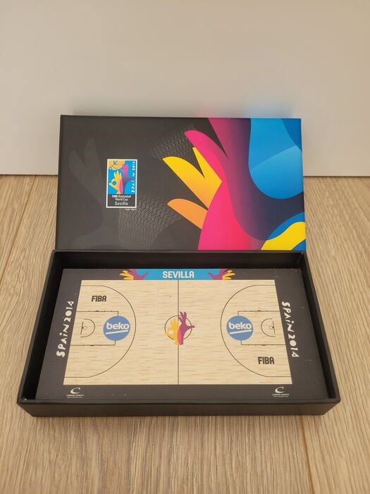 Origineel stuk parketvloer in de Pabellón de San Pablo in Sevilla, locatie voor de groepsfase van de FIBA Basketball World Cup (Spanje 2014). Officieel product vervaardigd door het Amerikaanse bedrijf Connor Sports in beperkte oplage. Conditie: nieuw.