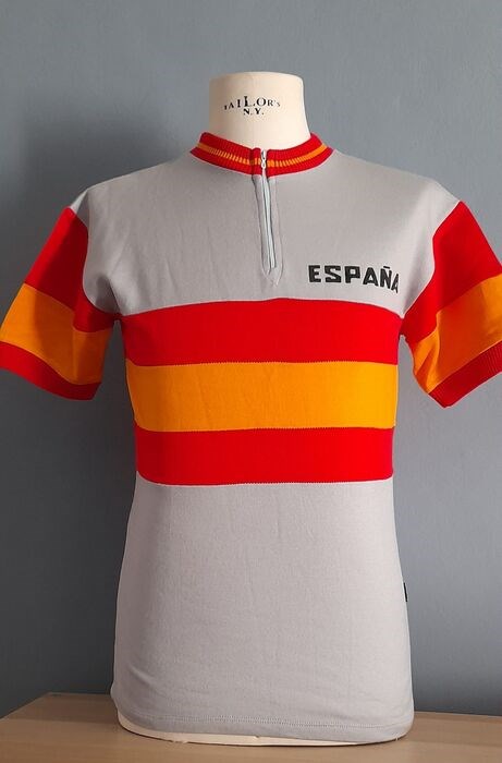 Prachtige Spaanse nationale teamtrui (maillot), zoals gebruikt door Marino Lejarreta op het Wereldkampioenschap van 1981. Het meet oksel tot oksel 49cm en is in uitstekende staat.