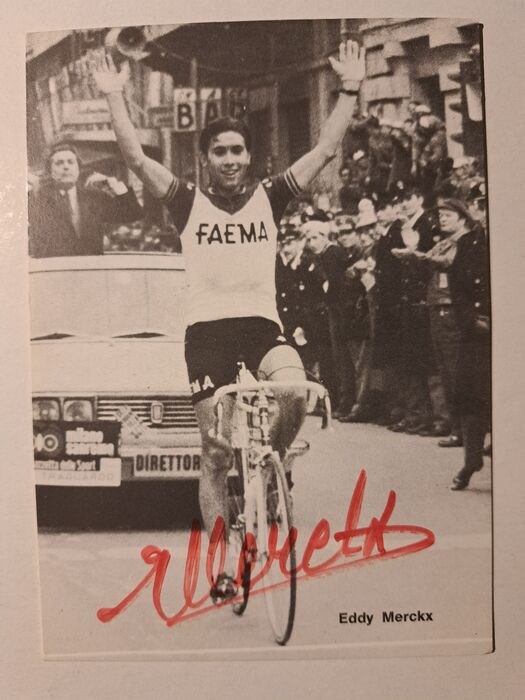 Gesigneerde (rode stift) fankaart Eddy Merckx, Faema.
