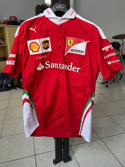Ferrari 2016 Scuderia-shirt geveild met het stiksel van de achternaam van de ingenieur die de memorabilia schonk. Opvallend zijn enkele kleine defecten die op de foto zijn gemarkeerd in de schaduw van het Santander-schrift en op het Puma-symbool. Zeer zeldzaam item, graag bieden iedereen!