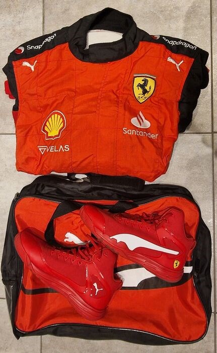 Ferrari PIT-STOP pak compleet met schoenen en tas, gebruikt tijdens het seizoen 2022 door het Ferrari Formule 1 Team Compleet met alle sponsoren, gebruikt maar in uitstekende staat in maat 52/54, schoenen in maat 40.5 gebruikt, licht vuil maar in perfecte staat staat als nieuw.
