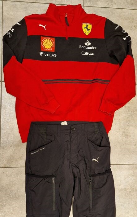 Ferrari Sweatshirt of Sweatshirt compleet met teambroek gebruikt door de technici tijdens het Formule 1-seizoen 2022, compleet met alle sponsors.