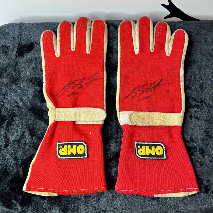 Er wordt geveild een paar racehandschoenen gesigneerd door 7-voudig wereldkampioen Michael Schumacher. Gemaakt door OMP in vuurvast materiaal (Name by Dupont en leer.