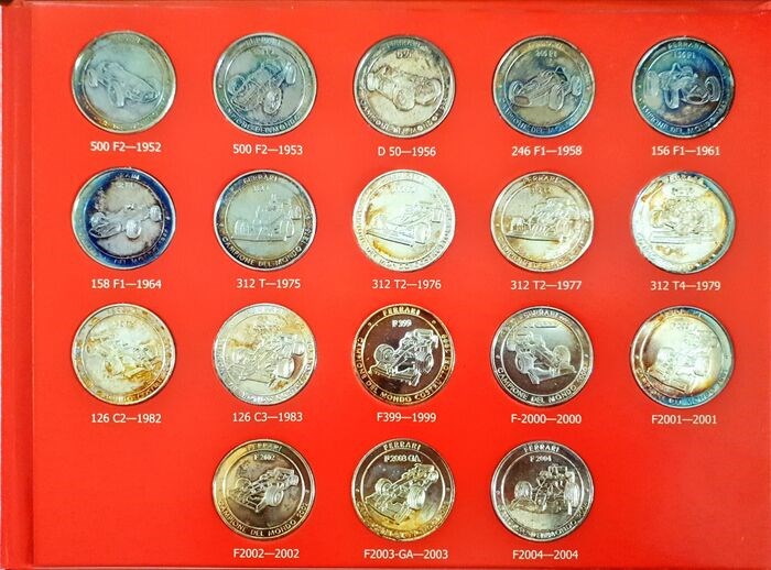 18 recordmunten met een afbeelding van de eenzitters aan de ene kant het Ferrari-schild + het Bolaffi-boek aan de andere kant.
