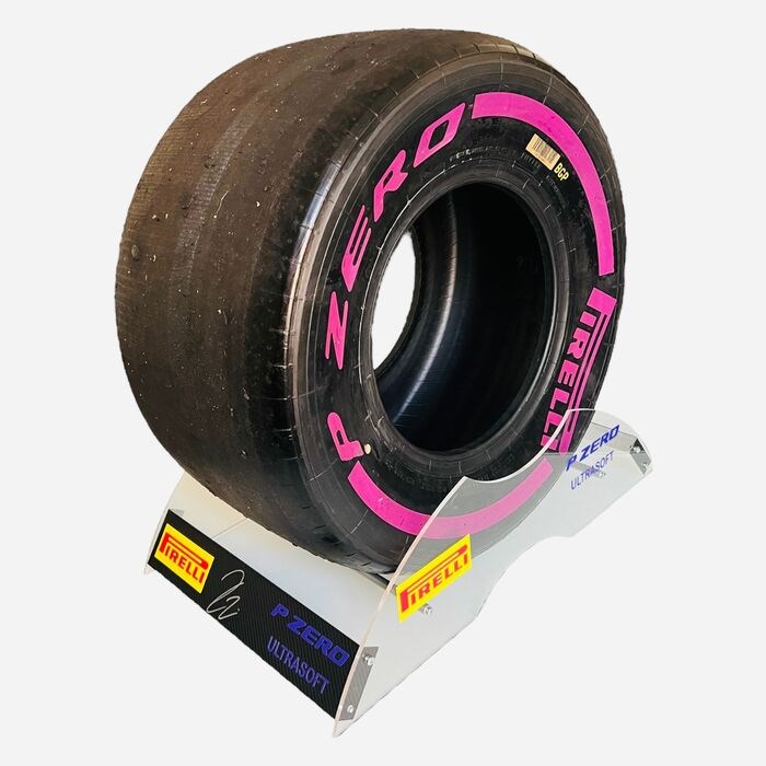 Pirelli F1-achterband met officieel Pirelli-display gesigneerd door de nieuwste Ferrari-wereldkampioen coureur Kimi Raikkonen! Exclusief artikel!