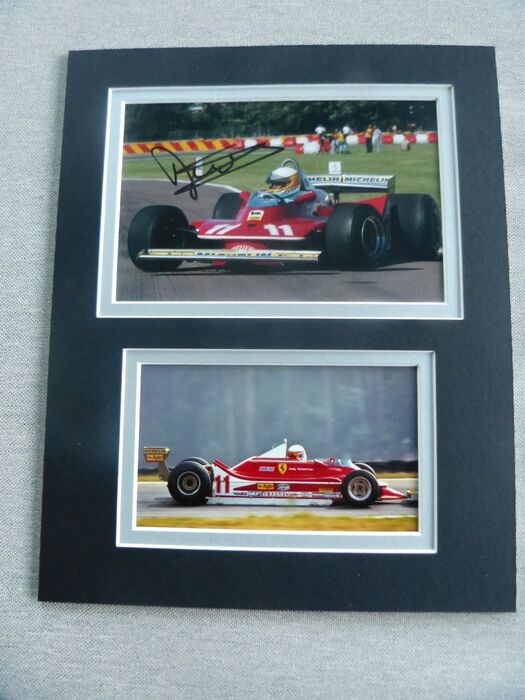 Handtekening met display van Jody Scheckter, voormalig autocoureur uit Zuid-Afrika.Scheckter won 10 Grand Prix, 10 pole positions en werd in 1979 Formule 1 wereldkampioen met een Ferrari.