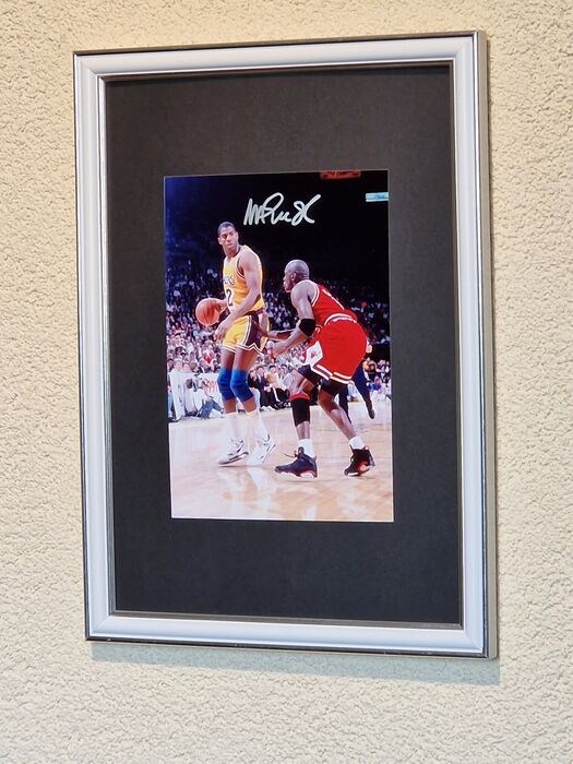Dit kavel is een handgesigneerde foto van 13x18,5 cm van Magic Johnson en Michael Jordan, handgesigneerd door Magic Johnson. incl een nieuw in seal budget lijst 23x32 cm. Winnende bieder ontvangt een hologram genummerd Collectables Unlimited Certificate of Authenticity (COA)