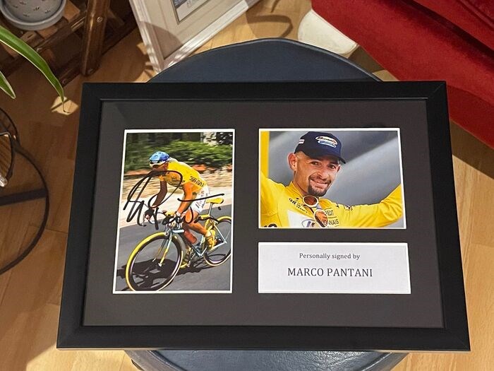 Foto autografata van grote Marco Pantani Tour de France "Il Pirata", grote foto circa 15 X 10cm incorniciata.