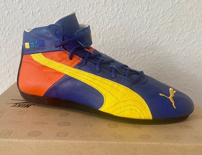 Een!! schoen voor Giancarlo Fisichella 2007. Hij gebruikte het model tijdens zijn tijd bij de Renault. De schoen heeft zijn naam handgeschreven op het label aan de binnenkant van de schoen en zijn logo's staan aan de buitenkant. De schoen is gemaakt door Puma.