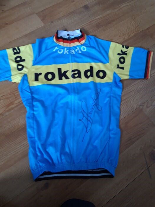 Prachtig retro wielershirt van Rokado met originele handtekening van Hennie Kuiper.
