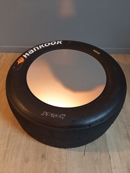 Originele Hankook formule 2 slick tyre / raceband als bijzettafel / salontafel met krasvrij spiegelblad ( nieuw en dubbelzijdig ) is mee getest op circuit, in goede staat - zie de foto's voor een goede indruk.