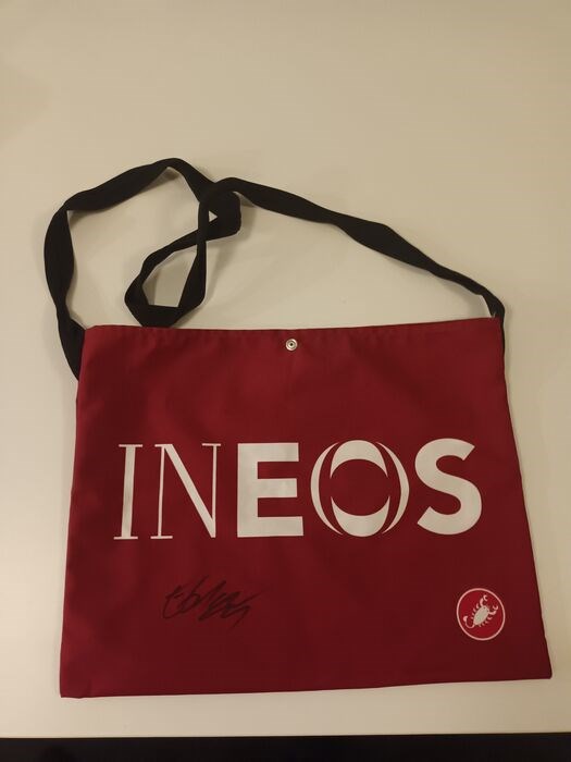 Mussette gekocht bij ProOwnedCycling en daarna persoonlijk getekend door Egan Bernal tijdens zijn eerste comeback-race, de Ronde van Denemarken, na zijn gruwelijke blessure. De laatste foto is direct na de handtekening genomen waarbij de mussette op de voorgrond staat en Egan op de achtergrond.