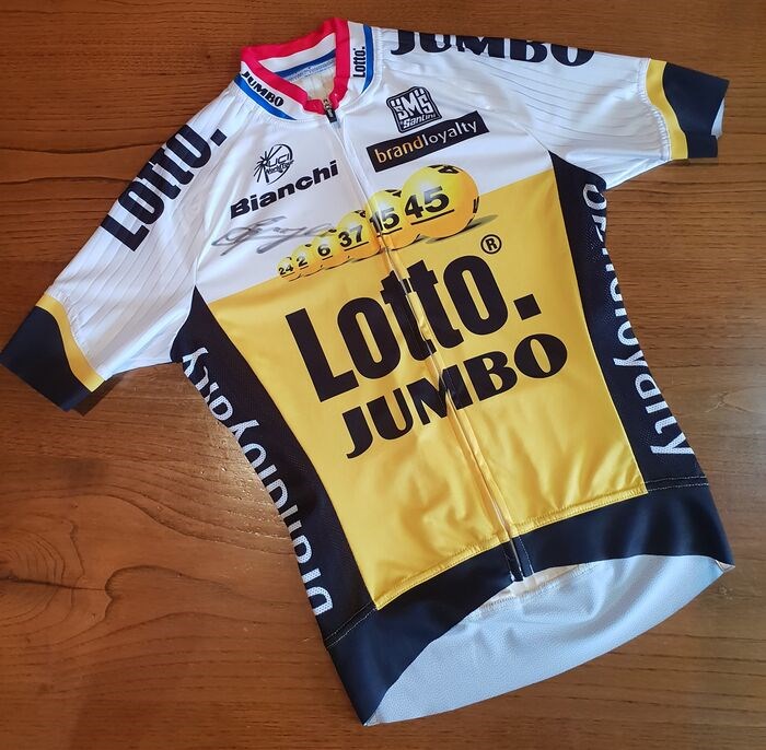 Te koop 2016 lotto jumbo dylan groenewegen jersey met custom kraag handgesigneerd komt uit privécollectie runner winnaar van 5 touretappes en routekampioen pasos bajos.een echt pareltje!!