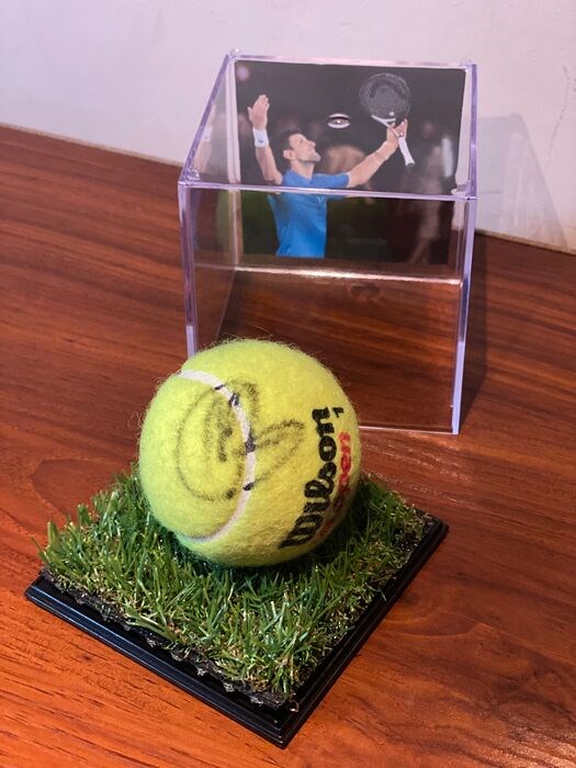 Wilson US Open tennisbal, gesigneerd en ingelijst door een van de beste tennissers uit de geschiedenis, Novak Djokovic. Handtekening verkregen na een toernooi. Er is een foto van het moment van de handtekening.