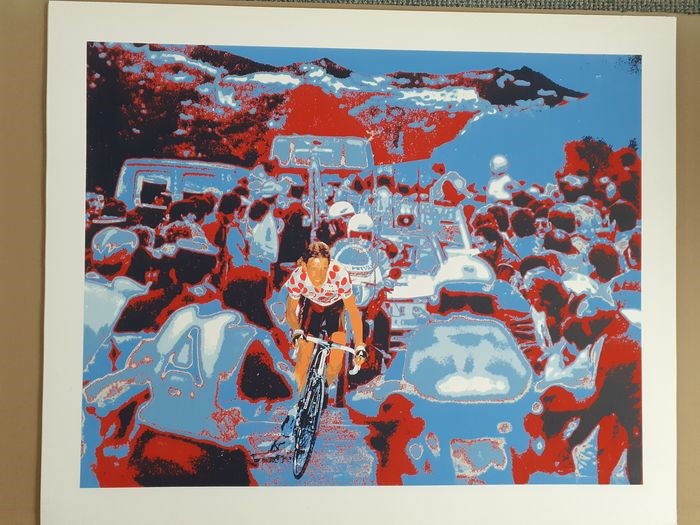 Kleurenzeefdruk uit 1988. Afmetingen 96 x 70 cm. Gesigneerd!, Met de naam van de kunstenaar en de titel: 'Rooks' Uit de nalatenschap van Henk van der Vet (1939 - 2016). Haagse kunstenaar/graficus die fotografie combineerde met reproductiemogelijkheden zoals zeefdruk. Gedrukt kwalities kenmerk rechtsonder de zeefdruk. Onderwerp van deze zeefdruk is Steven Rooks tijdens de Tour de France in de bolletjestrui te midden van publiek en motoren. Zeer dikke kwaliteit papier.