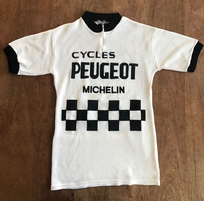Authentieke vintage wielertrui van team Peugeot Michelin, zoals gedragen door Bernard Thévenet, tweevoudig winnaar van de Tour de France (1975/1977). In originele en goede staat, geen vlekken of schade.
