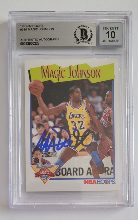 Mooie kaart van Magic Johnson gesigneerd door Magic Johnson, gecertificeerd door Becket met een 10 die extreem moeilijk te krijgen is en overeenkomt met de beste staat van de handtekening.