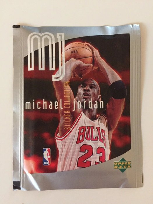 Doos met 100 gesealde pakjes, elk met 6 kaartjes/stickers van Michael Jordan!