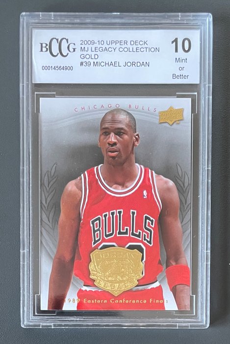 Wauw, een zeldzame gouden parallelle Michael Jordan 1989 Eastern Conference finalekaart uit de UD Legacy-collectie van 2009, bekroond met het maximale cijfer 10 door BCCG (Beckett). Deze kaart is een blijvertje. De plaat is in een goede staat en dat geldt ook voor de kaart.
