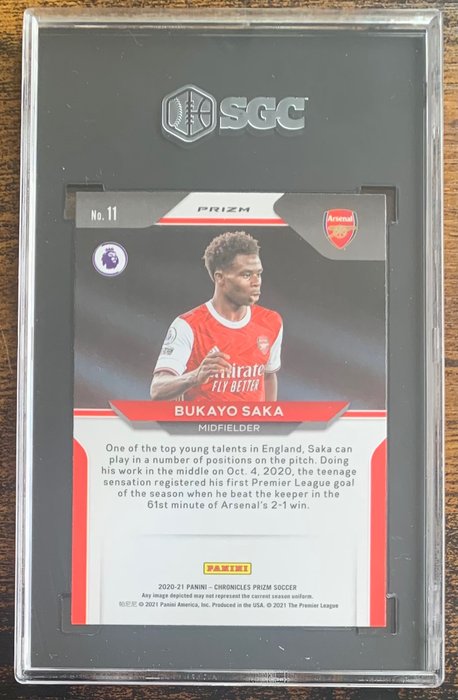 Schitterende Bukayo Saka rookie-kaart uit de 2020-21 Panini Chronicles Prizm Update-set.