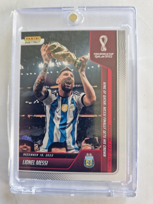 Het gaat over de ongelooflijke kaart van Lionel Messi die zijn eerste World Champion Cup opheft en die pas enkele dagen in Panini, Verenigde Staten, werd gepubliceerd.