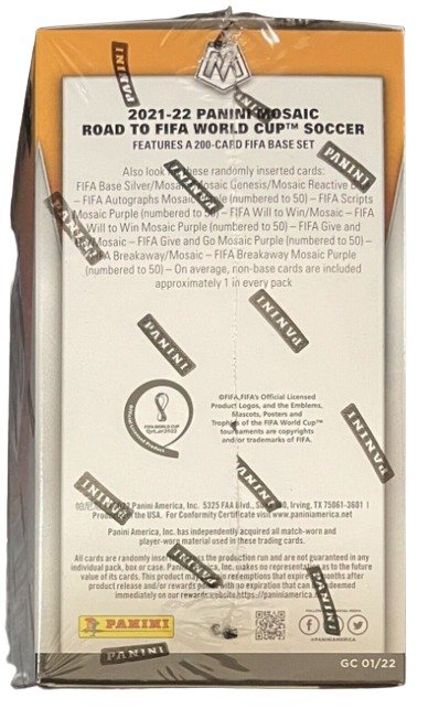Panini presenteert de 2021-22 World to FIFA World Cup Mosaic blasterbox! Elke doos bevat 6 pakjes met 6 kaarten per pakje. Kijk uit naar blaster exclusieve Orange Fluorescent Parallels! Zoek ook naar exclusieve handtekeningen van de beste spelers van de game! Elke doos kan 1 Zilveren & 4 Mozaïek Parallellen bevatten!