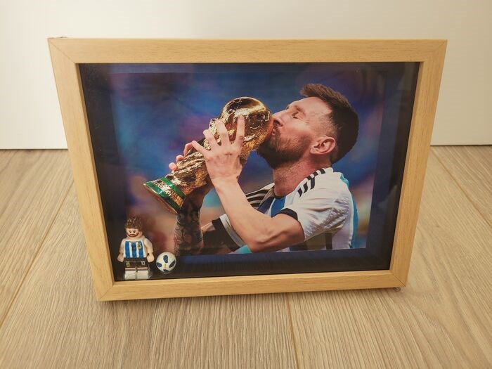 Mooie houten kist waarin de foto van Leo Messi met de trofee van de gewonnen wereldbeker op het WK in Qatar 2022 + Miniatuur Lego figuur van Leo Messi met het tenue van zijn team met het schild, nummer, naam en bal.