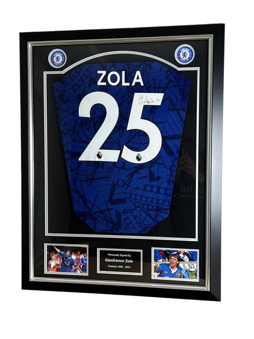 Chelsea 1997 FA Cup Final shirt met Zola 25 naam en nummer en persoonlijk gesigneerd door Gianfranco Zola.