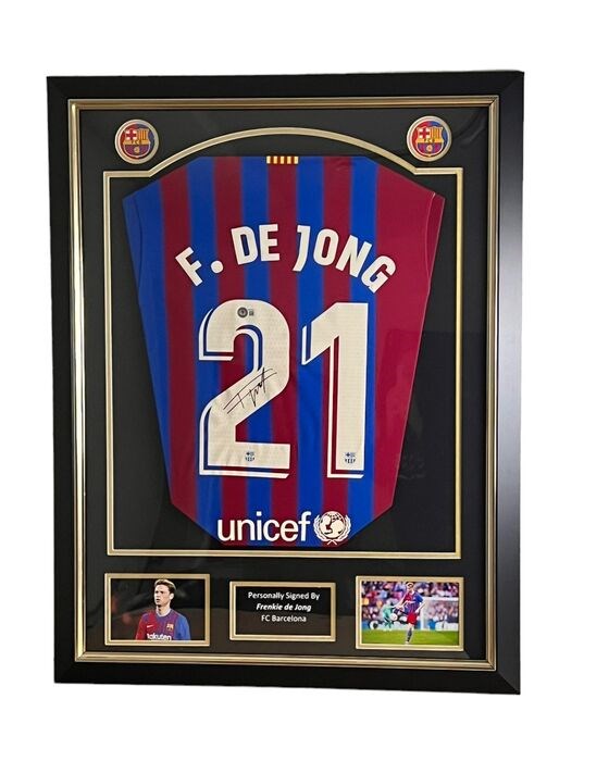 Frenkie de Jong gesigneerd Barcelona Home, 2021-2022 nummer 21 shirt. Persoonlijk met de hand gesigneerd door Memphis Depay tijdens een besloten signeersessie.