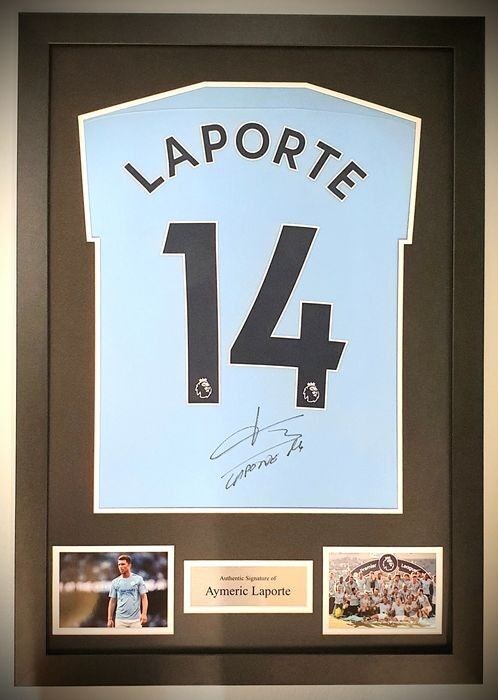 Aymeric Laporte gesigneerd en ingelijst Man City thuis 2020 shirt met COA