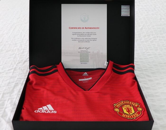 Manchester United volledige teamdoos, bevat Manchester United 2018/2019 shirt met de hand gesigneerd door het personeel met Manchester United echtheidscertificaat serienummer: MU1A53295J