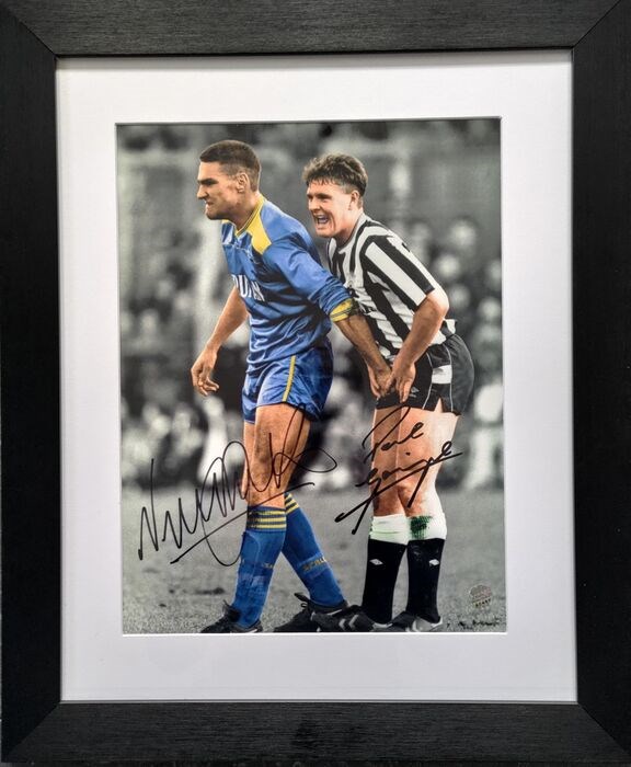 Maak kans op een iconische voetbalfoto, gesigneerd door twee legendarische spelers, Vinnie Jones en Paul Gascoigne!