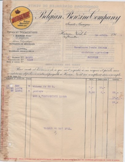oude factuur Belgian Benzine Company, Brussel, 1911,