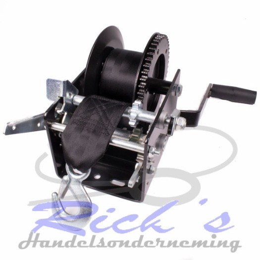 Zware handbediende lier met 7 meter band voorzien van haak met veiligheidsklepje.